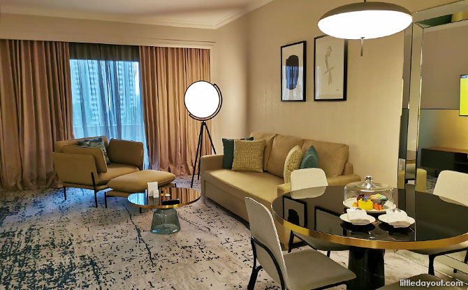 The suite consists of a living room, dining table, ensuite bedroom and also an additional washroom. We liked the contemporary look of the room with its mod-vintage furniture and bright colours. While it was situated in an old property, we could hardly tell with the rejuvenation. Main controls were one-touch and the mood lighting was a tad futuristic much like having the moon in the room.