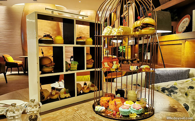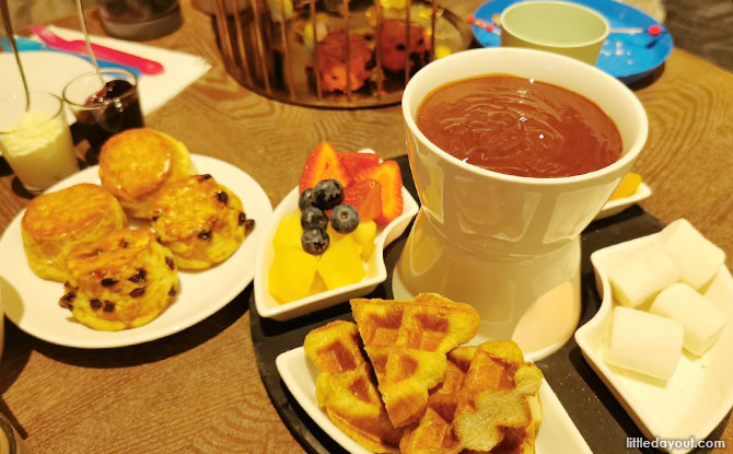 There are sets for adults and children comprising of delectable treats, both savoury and sweet. The adults’ portions have Citrus Cured Salmon, avocado, black pepper sour cream wrap, Prawn Cocktail brioche roll, Crispy Chicken & Fig jam slider, Egg, caviar focaccia, key lime tart, chocolate cake and Pandan Gula Melaka cake aside from macarons. It also came with a chocolate fondue, perfect for a family to share!