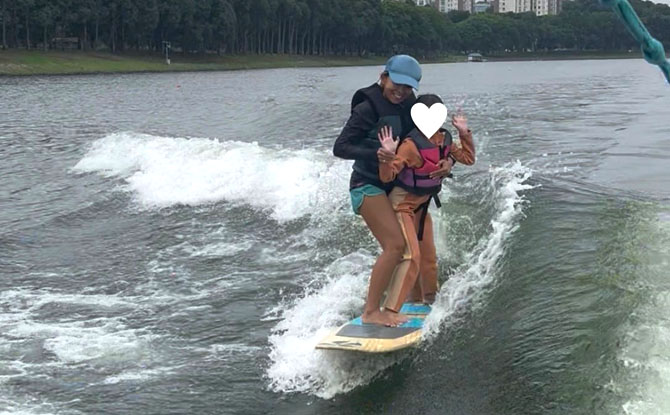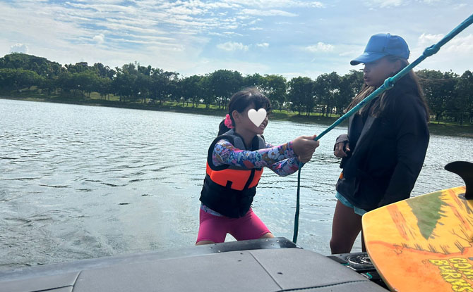 In her first lesson, she managed to stand and ride just outside the wake for a short stretch, which was a great start! She hasn’t quite found her balance to glide confidently yet, so she’s still holding on to the rope for now. Even before we left Bedok Reservoir Park, my girl was already asking me to book her next session so she can keep improving her skills.