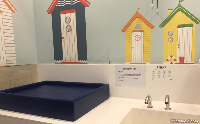 The nursing room at Waterway Point is clean and painted in soothing shades of blue with colourful illustrations of houses. The nursing room is also decently equipped with a bench, sink, hot and cold water dispenser as well as a padded diaper changing station. Nursing mothers who need a private space can seek refuge in the breastfeeding room which is lockable and consists of a comfy armchair, a small ledge and an electrical point. Do note that you need to press the intercom in order to use the room, a security measure to ensure that the nursing room is not misused.