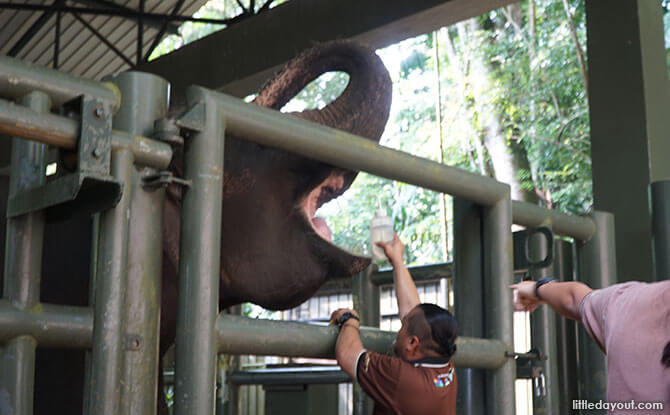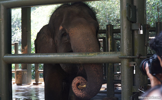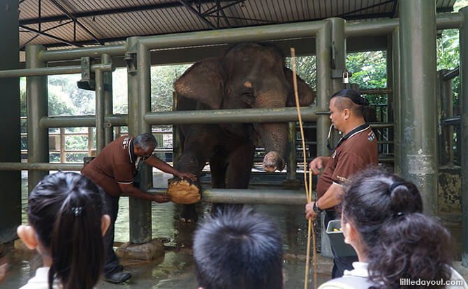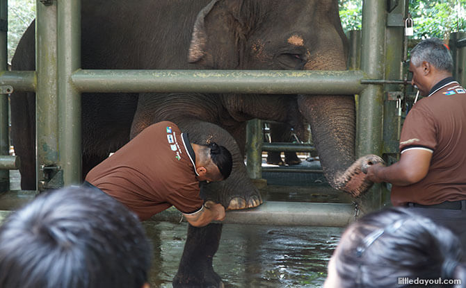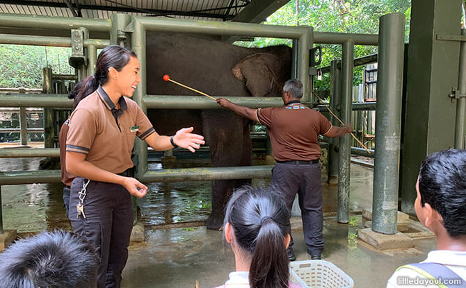 Singapore Zoo’s elephant keepers Seya Rama and Clement Bayang demonstrated how they take care of the elephants while we stood safely behind a marked yellow line,