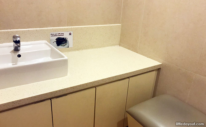 The nursing room at West Mall is small and minimally furnished with a sink, padded diaper changing station and a cushioned stool. Nevertheless, the lockable nursing room offers a private place for nursing mothers to breastfeed or for parents to change dirty diapers. However, there are no electrical points within the room which may make it inconvenient for mothers who need to express breastmilk.