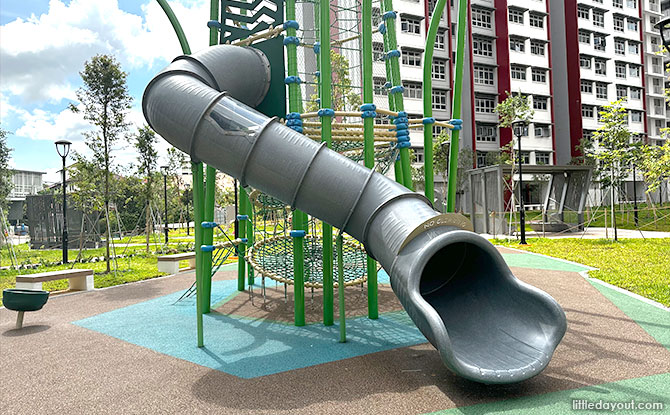 From the top of this Westscape @ Bukit Batok playground, there is a grey tube slide that leads back to the soft padded ground.