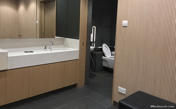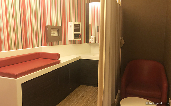 Spacious, clean and warmly-lit, the nursing room at The Shoppes at Marina Bay Sands is a cosy haven for parents to attend to their young children. The space is also well-equipped with a padded diaper changing station, sink, foldable child seat and a hot water dispenser for parents that need to prepare baby formula. There is a separate area in the nursing room with a small armchair, two electrical points and a small coffee table for mums to breastfeed or express comfortably. The auto lock door of the nursing room and curtains that can be drawn around the breastfeeding area make this nursing room a cosy and conducive environment for parents to make diaper changes or nurse in private.