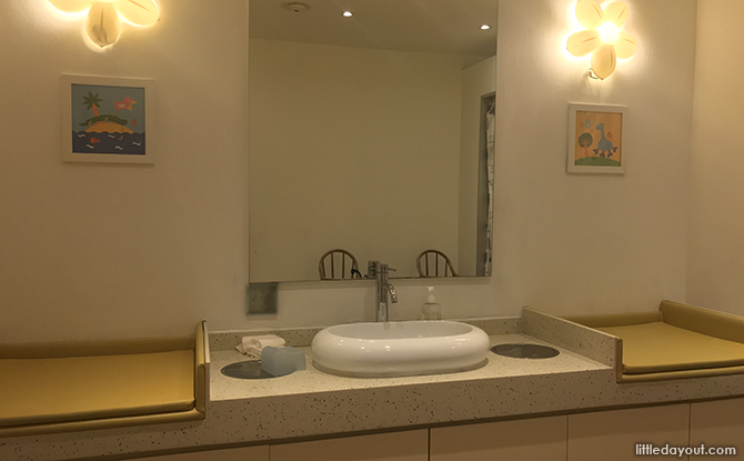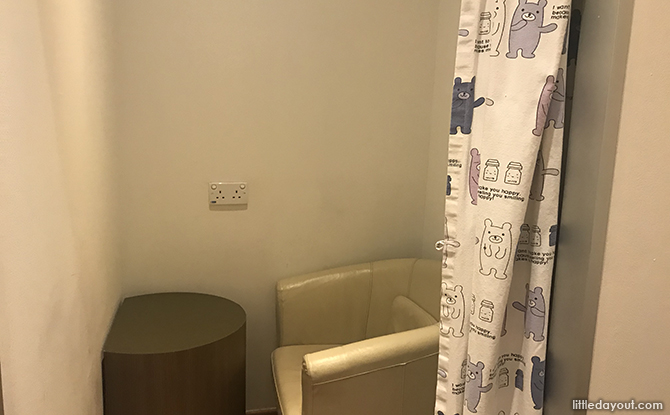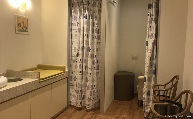In addition, the room contains two separate breastfeeding rooms, each well-equipped with an armchair, small coffee table and two electrical points – all the necessary amenities for nursing and expressing mothers. However, do note that there are no doors to the breastfeeding rooms, only curtains that can be drawn- meaning that privacy for nursing mothers is compromised. Another gripe would be the lack of hot water facilities and the fact that the nursing room’s door cannot be locked. Otherwise, the nursing room at Millenia Walk is a pleasant place for parenting duties.