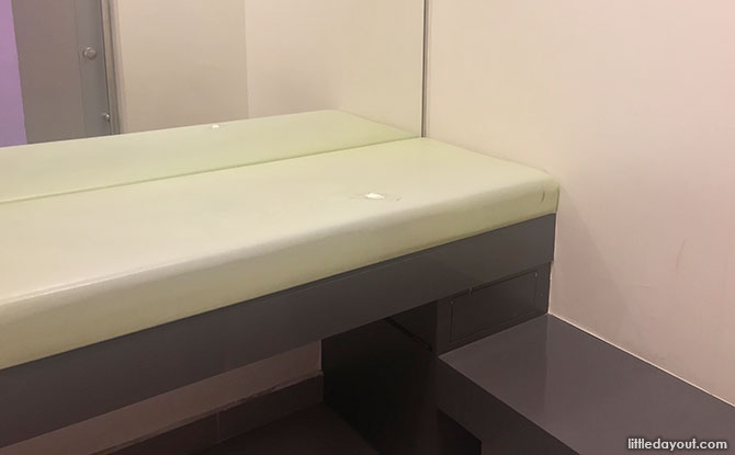The Parents Room is decently equipped with two padded diaper changing stations, a sink and a hot water dispenser. Diaper disposal bags are also provided. Nursing mummies can use the lockable nursing room located within the Parents Room, which contains a cushioned chair as well as two electrical points.