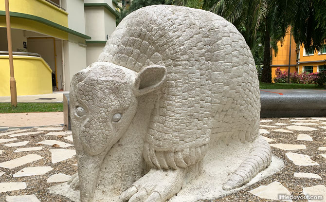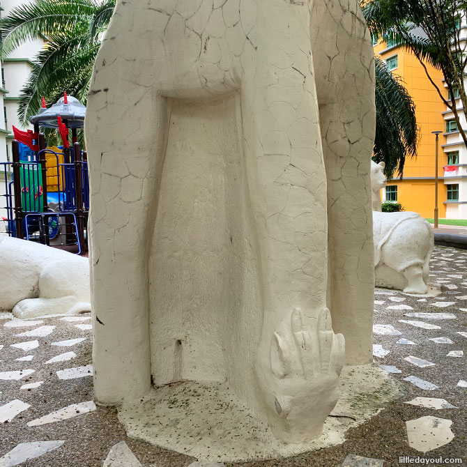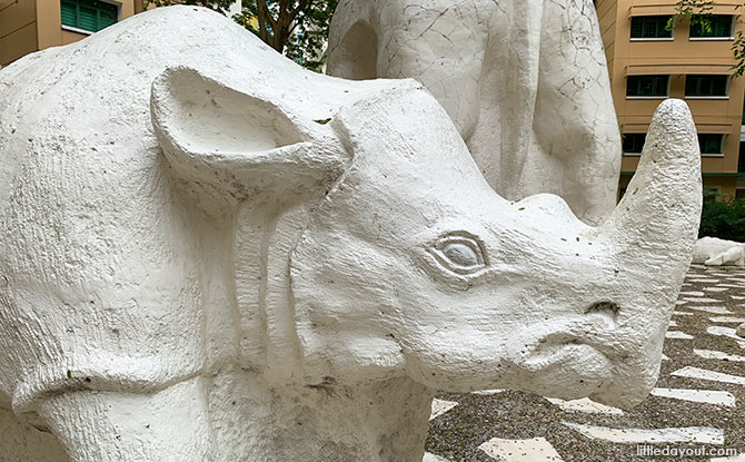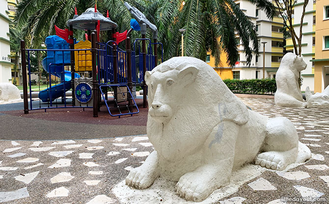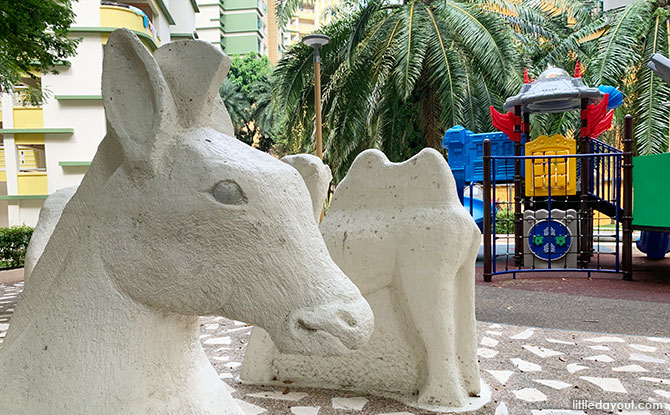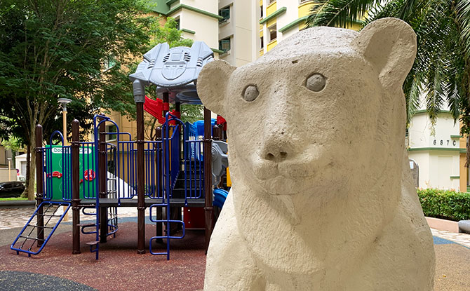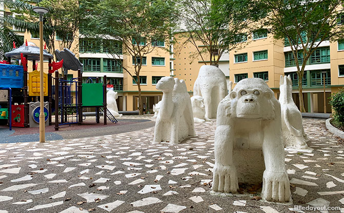 The white animal statues can be found scattered around the playground in front of Block 686B and 686C at Woodlands Drive 73. The collection of statues make the otherwise-ordinary HDB playground stand out from other neighbourhood playgrounds.