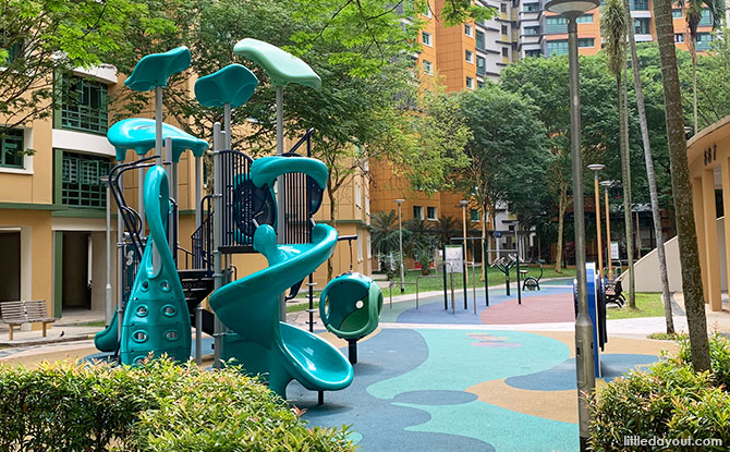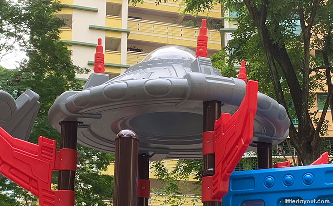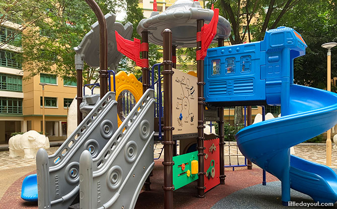 Besides the space-themed playground, there is another playground nearby, in front of the multi-storey car park, that kids can enjoy too.