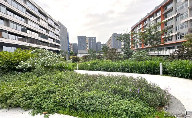 The meandering path that winds up from the plaza is lined with pretty flowers that can be found around Singapore.