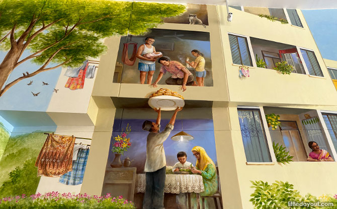 Above the coffee shop, the neighbourly spirit is alive and well with families sharing with one another. As one online commentator janaspiritdy put it, Yip was able to “capture the essence of our multi-cultural identity” in the mural.