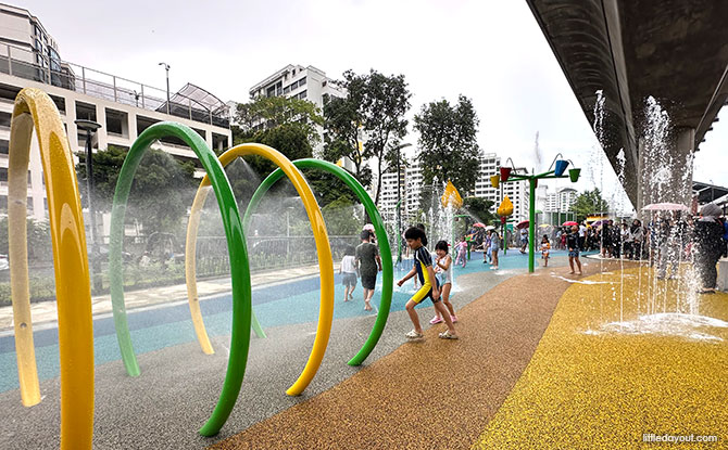 Just beside the Heritage Plaza is the water playground. This Yew Tee water play area will get kids very excited as it features spray tunnels and rocking buckets that send water splashing down.