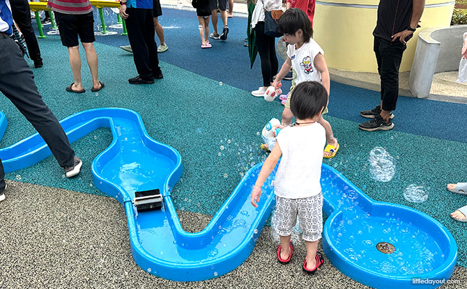 There is also a water play channel where kids can sail their toy ships, similar to the one found at Play @ Heights Park.