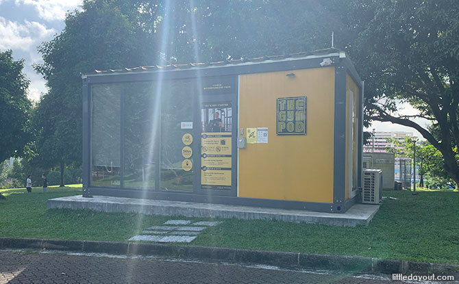 Close to the children’s playground is a “playground” for adults. This is the Gym Pod, a space at the park which can be booked for a workout.