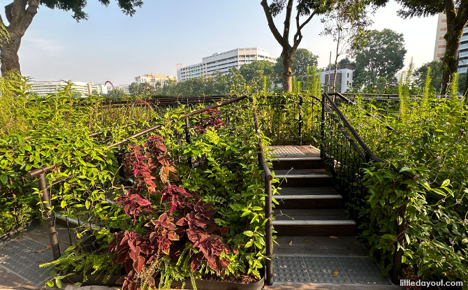 One of the unique features that are exclusive to the Yishun Pond Park Therapeutic Garden is the wheelchair-accessible exercise bridge, mound therapy stairs and mound seat therapy.