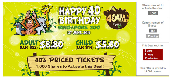 Requiring 1,000 shares for the deal to be activated, this offer, which is limited to 15,000 buyers only, will see Singapore Zoo’s adult and child tickets available at $8.80 and $5.60 respectively. This is 40% of the usual Zoo admission prices of $22 for adults and $14 for children.